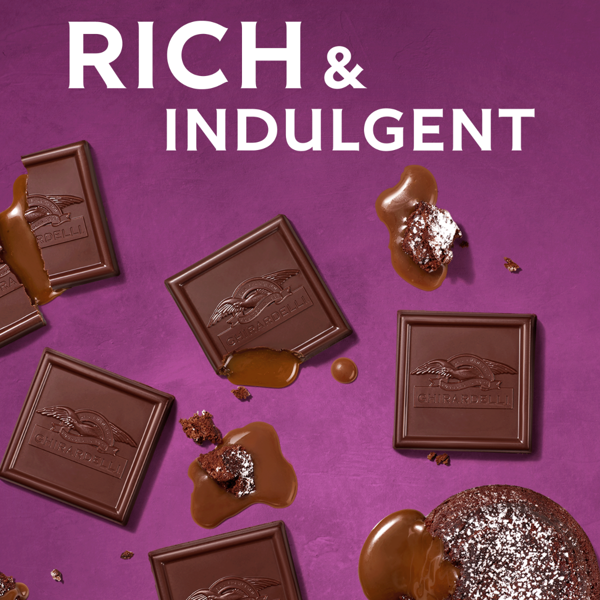 Unwrap GHIRARDELLI Dark Chocolate Lava Cake SQUARES for moments of pure indulgence. GHIRARDELLI SQUARES bring a touch of sweetness to your day, whether savored on their own or paired with your favorite treat. Let each bite of rich, slow-melting dark chocolate and luscious chocolate-flavored caramel filling transport you to dessert heaven. Share the sweet moments of joy and delight with someone close to your heart when you give these chocolate candy SQUARES as a gift. Crafted with premium ingredients, including high-quality cocoa beans, each individually wrapped square is perfect for savoring or sharing. GHIRARDELLI Makes Life a Bite Better.
