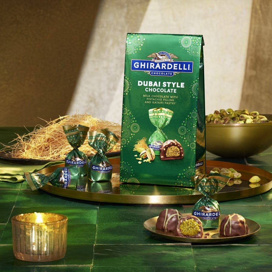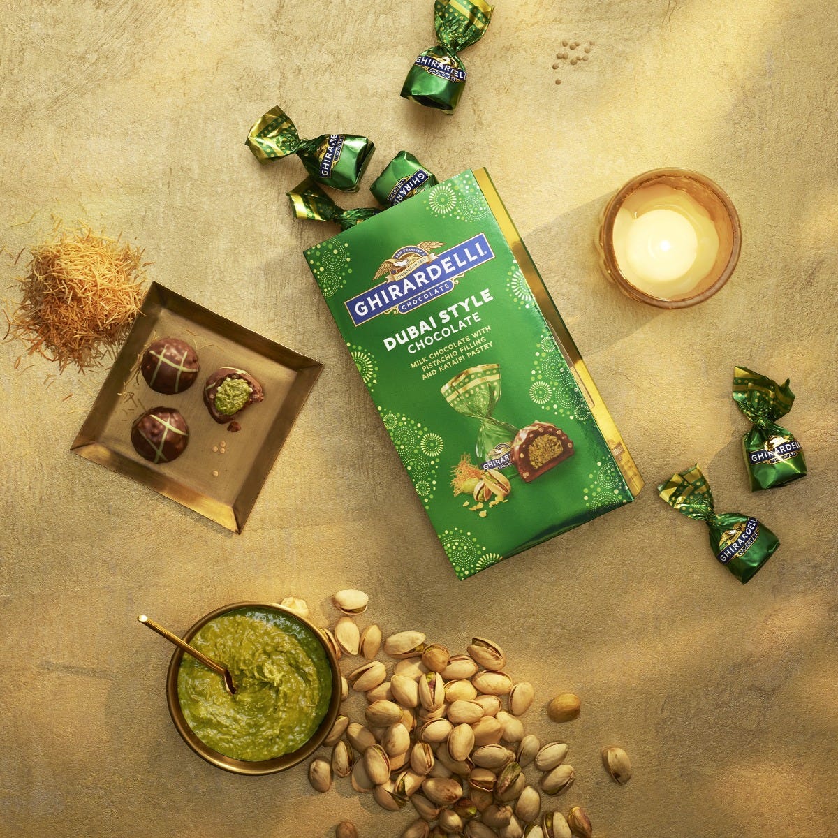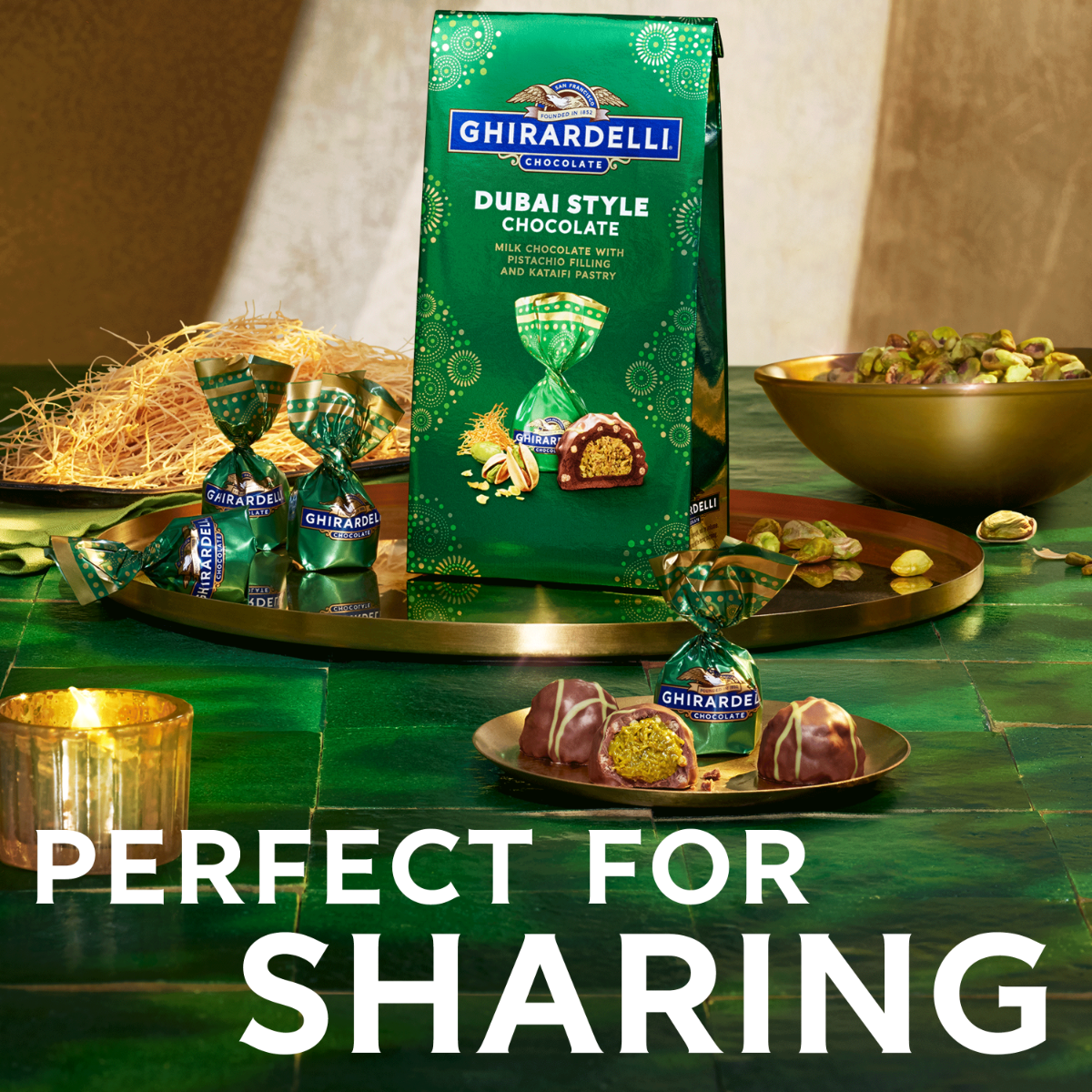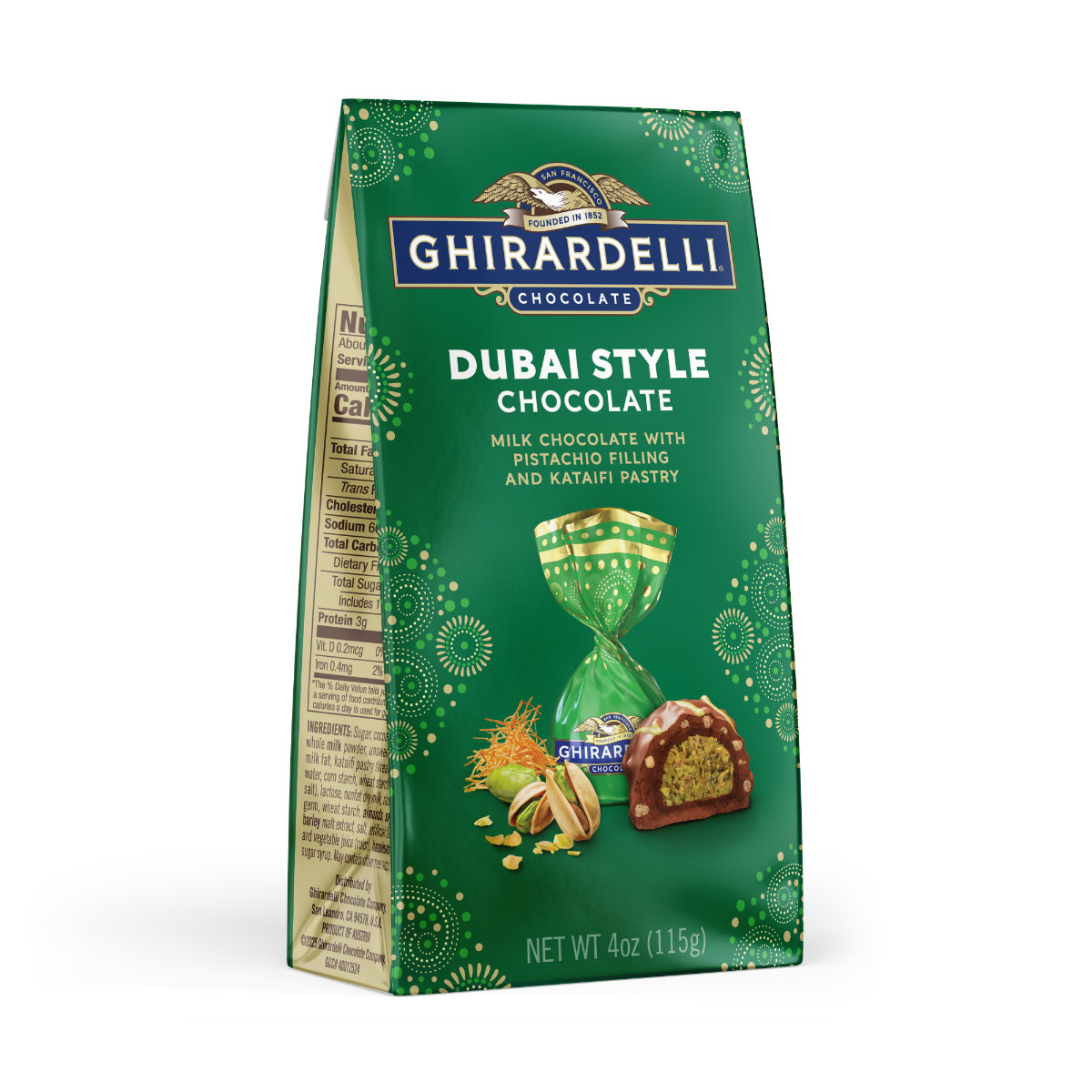 Enjoy the great taste of GHIRARDELLI Dubai Style Milk Chocolate for an incredible chocolate experience. A rich GHIRARDELLI milk chocolate with pistachio filling and crispy toasted kataifi, creating a delightful crunchy bite in each piece. GHIRARDELLI crafts each product with premium ingredients and high-quality cocoa beans. GHIRARDELLI Makes Life A BITE BETTER.