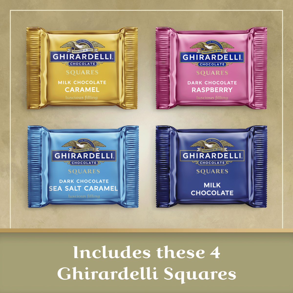Experience rich GHIRARDELLI chocolate in this collection of indulgent flavors. This beautiful new gold gift box adds a touch of elegance to any gifting or sharing occasion. There’s a chocolate in this collection for everyone, whether you crave rich, indulgent milk chocolate, slow-melting dark chocolate, tart raspberry or luscious caramel. Each box of GHIRARDELLI squares includes a variety of best selling flavors, and with approximately 60 GHIRARDELLI chocolate squares, there will be plenty of chocolate for friends and family to enjoy. GHIRARDELLI chocolate squares are individually wrapped, making them ideal for snacking spreads or as an after-dinner treat. Committed to ultimate quality from bean to bar, GHIRARDELLI chocolate is crafted with care using high quality ingredients for a smooth, delectable treat. GHIRARDELLI Makes Life a Bite Better.