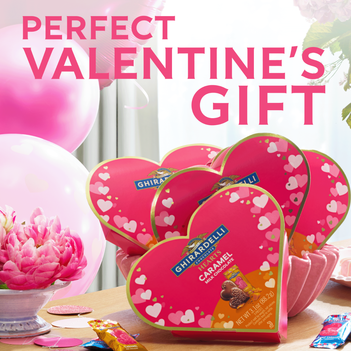 • One (1) 3.1oz gift of GHIRARDELLI Caramel Milk Chocolate Hearts