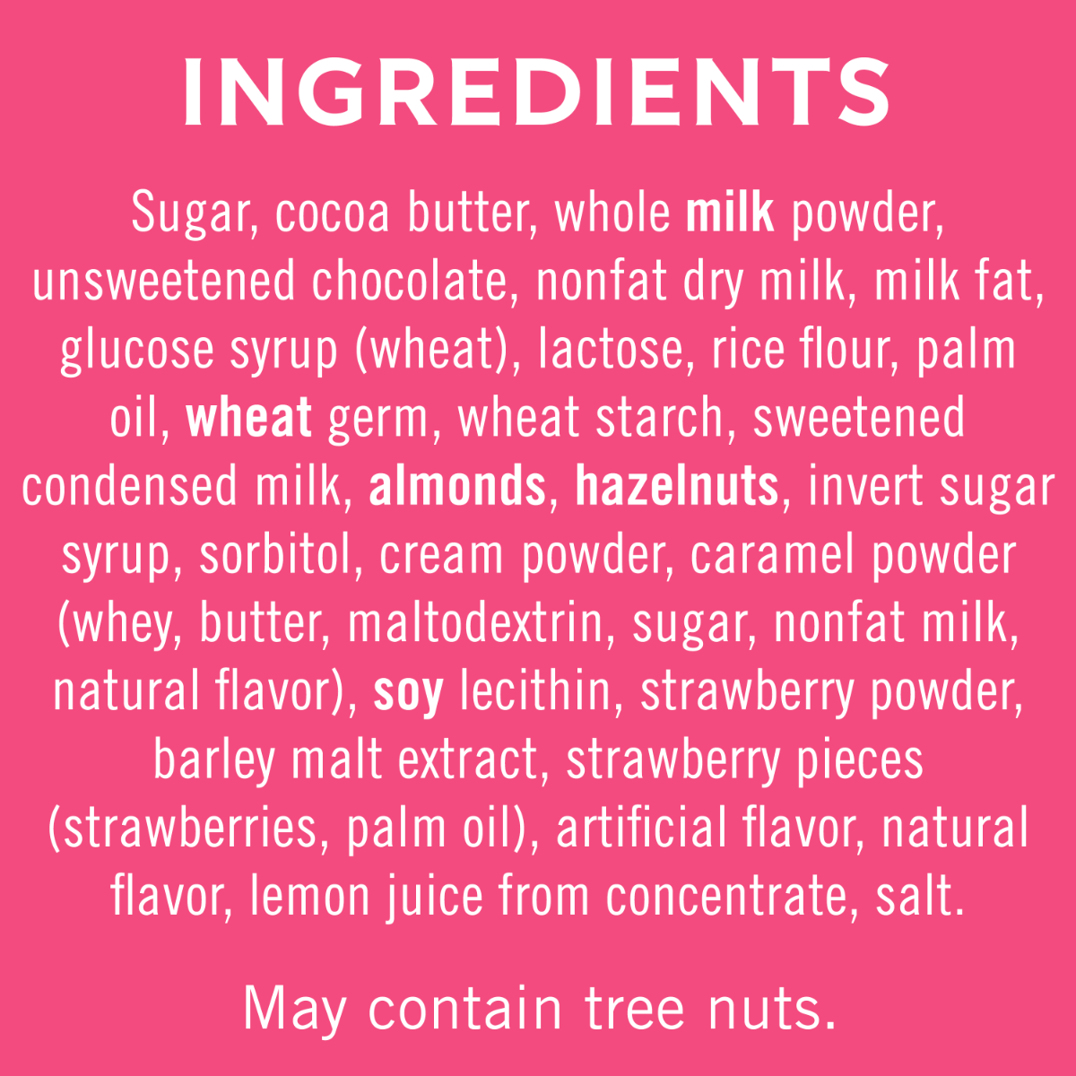 - Rich GHIRARDELLI milk chocolate in 3 delightful flavors – Milk Chocolate Caramel with Crisps, Milk Chocolate Strawberry Cream with Crisps, and Milk Chocolate Almond Nougat with Hazelnuts and Crisps